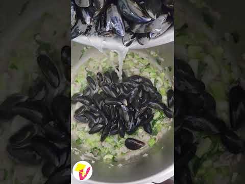 - Ajouter les moules, couvrir et cuire à feu vif pendant 9 minutes en mélangeant à mi-cuisson.